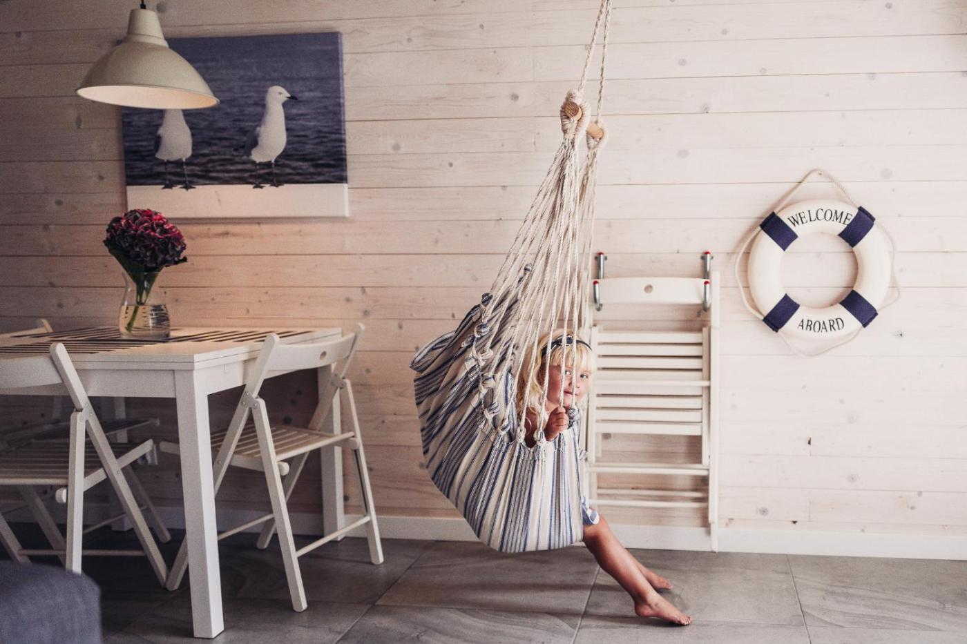 Wszystkie domki obejmują część wypoczynkową. Niektóre z nich dysponują również jadalnią ilub tarasem. W każdym domku znajduje się aneks kuchenny z lodówką i płytą kuchenną. Na terenie całego obiektu Marynarskie Domki można bezpłatnie korzystać z WiFi. Dla Gości przygotowano także ręczniki i pościel.