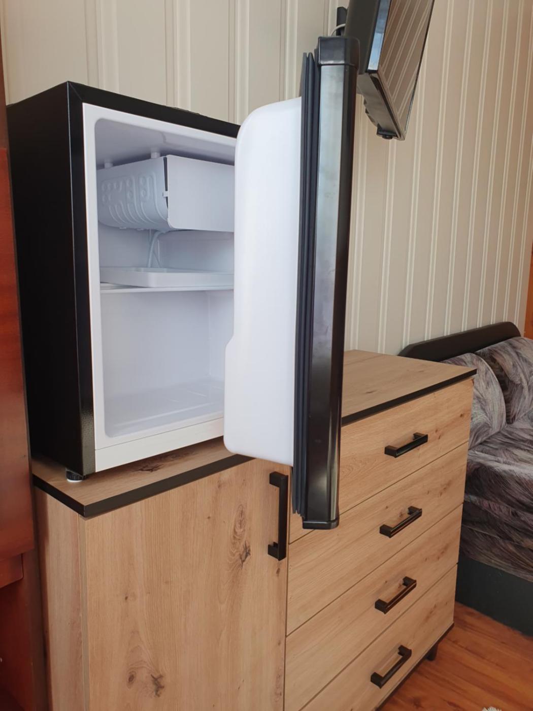 Wyposażenie obejmuje również lodówkę i czajnik.