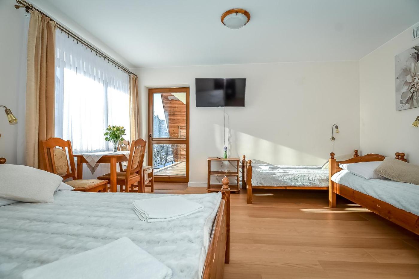 Pokój Czteroosobowy. Ten ogrzewany pokój czteroosobowy dysponuje szafą, balkonem z widokiem na góry oraz łazienką z prysznicem. W tej opcji zakwaterowania zapewniono 3 łóżka. Pokój Czteroosobowy - 4 osobowy. Powierzchnia pokoju ok.: 12 mkw. ;